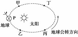 下图所示是“地球公转的轨道图”,图中甲、乙、丙、丁四点将轨道均分成四等份,读图回答8~9题。