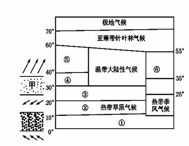 (1)图中甲气压带的名称是 ;根据图中气压带、风带的位置,可以判断上图所示是北半球的 (季节)。