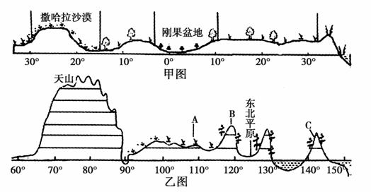 (1)甲图中自然带的分布特点是_________________________ _______,体现了自然带________分异规律。