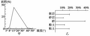 下图中的甲为某滑坡区域坡度面积频率分布图,乙为某滑坡区域土质分布图。读图回答下列问题。