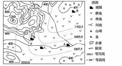 (1)此时,A城镇风向是 。A与D相比,晴天概率大的是 ,原因是____。