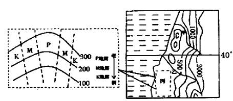 下图为某大洋东岸大陆等高线地形图:左图为丙区域的放大图,其中实线为等高线(单位:米),虚线为地层界线。