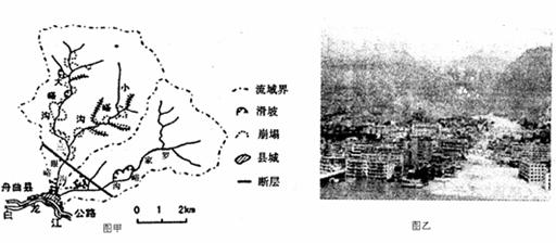 材料二 图甲为舟曲泥石流发生区域示意图,图乙为被泥石流损害的舟曲县域。