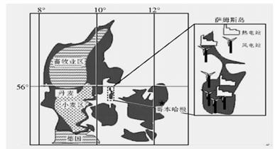 2012年6月15日,国家主席胡锦涛考察丹麦的风能发展,风电占丹麦总发电量的20%,萨姆斯小岛是丹麦的新能源样板区,岛上能源自给自足,几近“零排放”。读图,完成1〜3题。