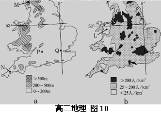 图10示意某国部分地区的地形(a)和人口密度(b)。读图,完成22~23题。