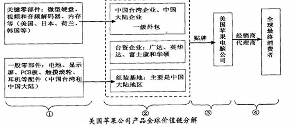 读“美国苹果公司产品全球价值链分解图”,完成13~16题。