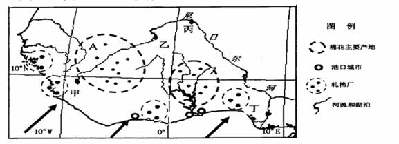 (2)分析材料二,判断A地区的气候类型 ,依据材料一判断尼日尔河甲、乙、丙、丁四点降水最小的点并说明原因。(5分)