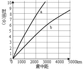2012年12月7日,日本东北(33.0°N,144.6°E)发生了里氏7.3级地震。若图3表示本次地震的时距曲线(地震波随时间而传播距离差异),回答第5题。
