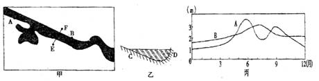 某研究性学习小组调查了我国东部河流某河段的情况,并绘成该河段示意图甲、BF河段河床剖面示意图乙和A、B两水文站测得的水位变化图丙.据此回答24—25题。