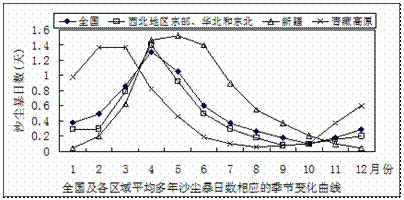读“全国及各区域平均多年沙尘暴日数相应的季节变化曲线”,回答6~7题。