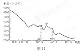 图11为中国沿1100E经线日平均气温连续>100C的积温曲线图。读图完成21-22题