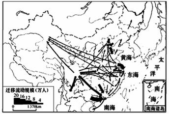 世纪80年代后我国人口迁移主要流向及流动规模图。