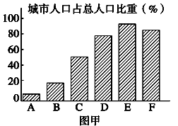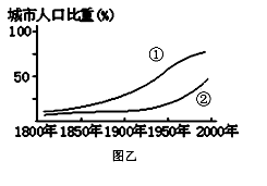 (3)依据经济发展水平的差异,世界上的国家和地区分为两种类型。指出图乙中①属于__________国家,②属于______国家,简述两类国家城市化的特点。