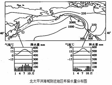 ⑴图中A、B两地的年降水量较多的是 地,分析其降水较多的原因。(4分)