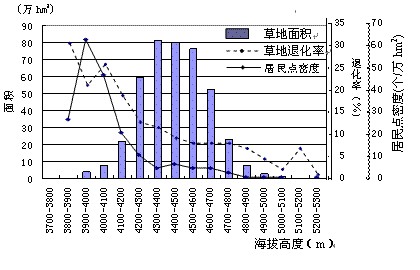 A.居民点密度越大草地退化率越高 B.海拔4300~4400米的草地退化面积最大