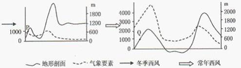图2为“北美大陆西岸两处地形和某气象要素的关系图”,回答6~7题。