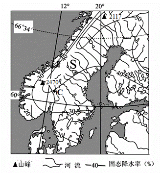 固态降水率是指固态降水(雪、雹等)量占全年降水总量的百分比。图示意S半岛及周边地区等固态降水率线分布。读图回答下列问题。