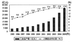 材料一 下图为我国高新技术产业工业总产值及其占制造业的比重(1995—2005年)图。