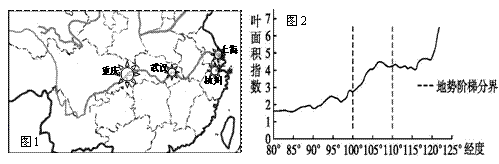 图1为我国夏季长江流域部分火炉城市分布图,图2为30°N植被叶面积指数变化示意图(叶面积指数是指单位土地面积上植物叶片总面积占土地面积的倍数), 读图完成1~2题。