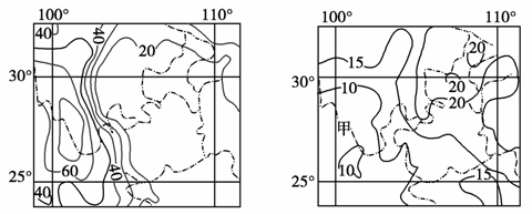 下面为我国西南地区1月(左图)和7月(右图)晴天出现频率(%)图,读图回答10~11题。