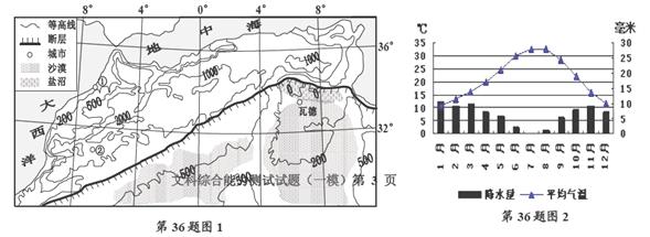 古代阿拉伯人把今突尼斯、阿尔及利亚和摩洛哥所在地区统称为马格里布地区。图1 为马格里布地区示意图,图 2 为该地区瓦德市的气候统计图,表 1 为图 1 中①、②两城市各月平均日照时数表(单位:小时)。完成下列问题。