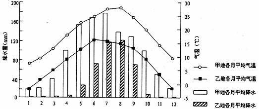 A.甲地年平均气温较乙地低 B.乙地降水较甲地丰沛
