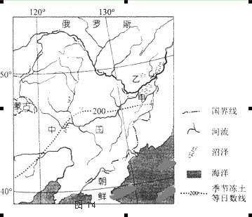 (1)指出图中季节冻土等日数线的走向及其主要影响因素。(4分)
