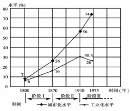 下图表示某国工业化与城市化进程,读图,回答27-28题。