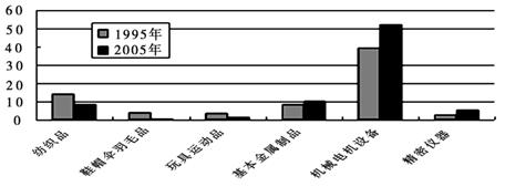 C.纺织品产值降低 D.纺织品与鞋帽伞羽毛品产值比重变化最接近