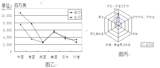 材料二:“南非对主要贸易伙伴进出口商品值(图乙)”及“南非对中国出口商品构成(图丙)”(统计时间:2012年1-9月份)
