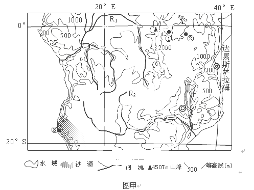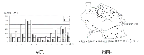 根据图文(图甲为非洲局部区域图,图乙为图甲中①、②两地的降水量统计图,图丙为坦桑尼亚主要矿产资源分布图),完成下列问题。