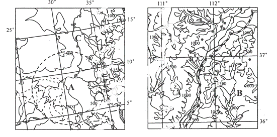 (1)在左图中,A地区(虚线内)的地形类型是_____________________,判断依据是______________________。在右图中,B地区的特殊地貌是________,形成该地貌的主要地质作用是______________________和____________________。(5分)