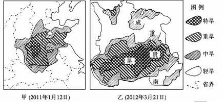 气象干旱是指某时段内,蒸发量和降水量的收支不平衡,水分支出大于水分收入而造成的水分短缺现象。读我国两地区气象干旱分布图,回答下列问题。(10分)