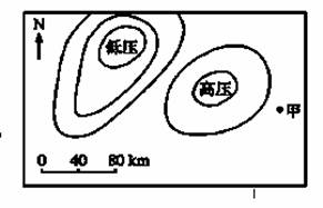 下图示意长江中下游地区夏初某时的气压系统。该气压系统以每天120千米的速度自西向东移动。据此完成3~4题。