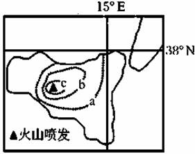 下图中虚线是某岛屿火山喷发后火山灰厚度等值线,a<b<c。读图,完成1-2题。