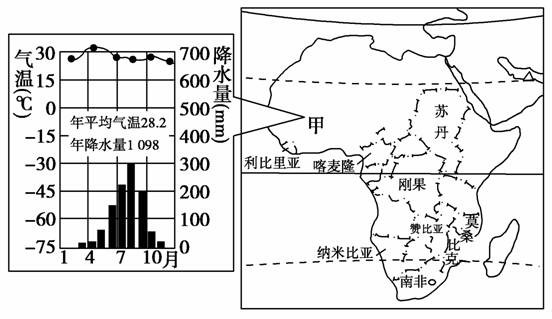 2010年10月13日从非洲传来喜讯,宜昌专家组在塞内加尔水稻种植获得重大技术突破,杂交水稻新品种喜获成功。地处非洲的甲国(如下图)希望与中国展开合作,以缓解其粮食供应紧张问题。结合非洲略图及相关气候资料图,完成1--2题。