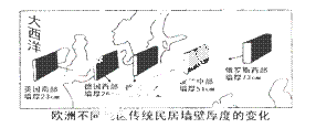 下图为欧洲传统民居自大西洋沿岸向东至俄罗斯的墙壁厚度的变化规律。据图完成12~13题。