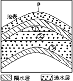 下图为某地地层示意图。从P点向下钻井,当钻头位于①、②、③“层”时,可能分别探测到