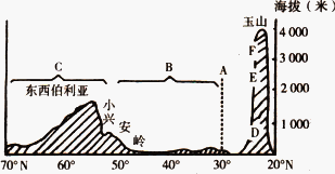 图中字母代表的自然带名称是:A________,B________,C________,D________,E________,F________。