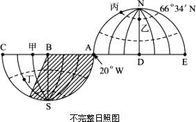 读“极地投影太阳光照图”(下图),虚线表示极圈和回归线,阴影部分表示黑夜,完成下列问题。