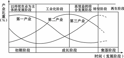区域的发展一般可分为三个阶段:初期阶段、成长阶段和衰落阶段。初期阶段主要表现为以传统农业为主体,成长阶段可分为工业化阶段和高效益的综合发展阶段。结合下图,回答下题。