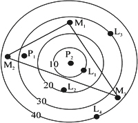 P2是企业乙的运费最低点。以P2点为圆心的同心圆是企业乙的等运费线,即企业乙从P2点移动而产生的单位产品运费(货币单位:元)增加额相同点的连线。假设劳动力费用(货币单位:元)从P2点向周围降低,生产单位产品所需劳动力费用在P2点为50元,L1点为42元,L2点为28元,L3点为20元,L4点为15元。当综合考虑运费和劳动力费用时,企业乙将从P2点移向