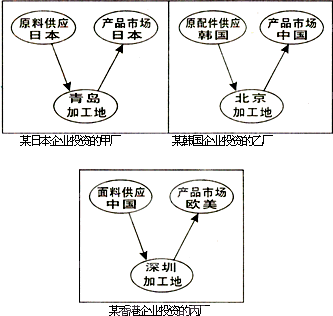 下图为三家企业投资建厂的原料地、加工地和产品市场示意图。吸引它们在我国东部沿海地区三地投资办厂的最主要因素分别是