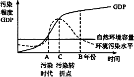 下图为某发达国家经济发展与环境示意图,读图回答下图所示环境污染程度较低的理想年代是