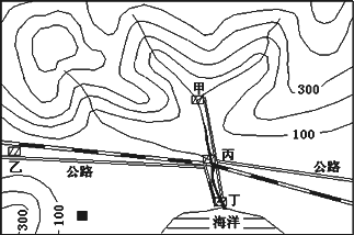 下图左侧为沿海某地区等高线图,右侧是以300视角分别从A、B、C、D四点俯看本区的网面立体图,该地人口密集,是东南亚主要水稻产地之一,据此回答下题