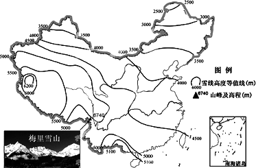 雪线高度是指永久性积雪的下限高度,与所在地区的气温与降水有密切关系。下图是根据我国气象台站观测资料模拟的各地雪线高度分布示意图。读图回答下题。
