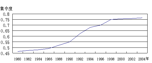 下图为1980年至2004年我国服装产业空间集中度示意图,由此图可以看出该类产业将直接导致我国