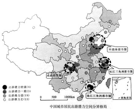出游潜力是指居民潜在的出游能力,是衡量客源地居民旅游购买力的重要指标。下图为“中国城市居民出游潜力空间分异格局图”,该图反映出