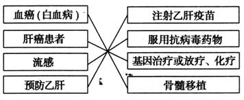 本题考查同学们应用所学知识,结合生活体验分析问题、解决问题的能力。白血病可采用骨髓移植的方法来治疗;肝癌患者可以用基因治疗的方法从根本上加以治疗,也可以用传统的放疗、化疗的方法;流感是由流感病毒引起的,所以应该服用抗病毒的药物;预防乙肝用相应的乙肝疫苗。