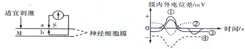 以枪乌贼的粗大神经纤维作为实验材料,在神经纤维S处的细胞膜内外放置电极a和b(如下左图),在图中M点给予一次适宜刺激,通过电压表测量神经细胞膜内外电位差(膜内外电位差=膜外电位一膜内电位)。右坐标图中符合实验结果的曲线是 ( )
